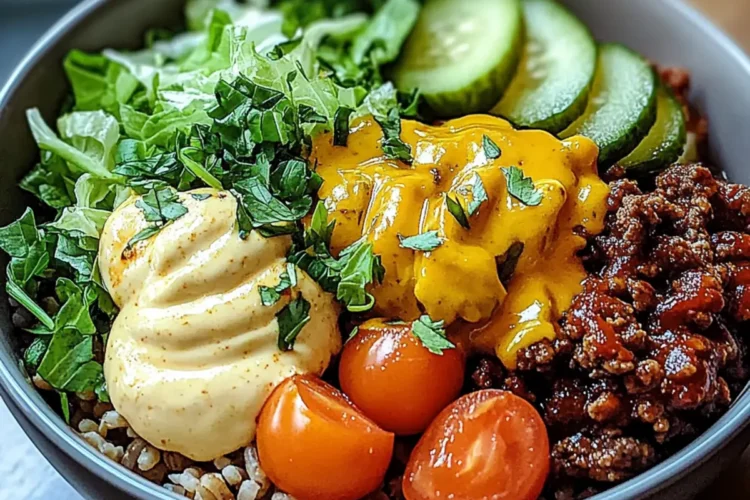 Once everything is ready, start assembling your Amazing Burger Bowls. Layer about a cup of the cooked brown rice at the bottom of each bowl. Top it generously with the seasoned ground beef, then add a handful of shredded lettuce, a scattering of cherry tomatoes, and a few pickles. Finally, sprinkle shredded cheddar cheese on top for a creamy finish.