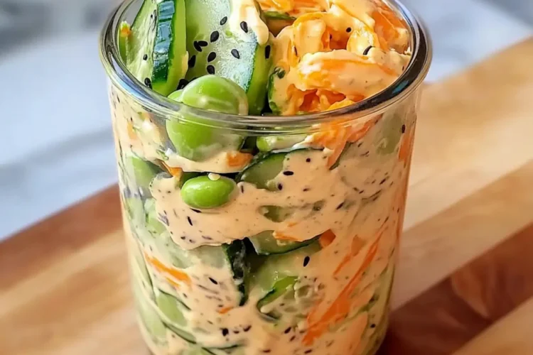 Take a clean mason jar or bowl and begin layering the ingredients. Start with the thin slices of cucumber, pressing them gently at the bottom to create a solid base. Follow with the chopped green onions, tofu cubes, edamame, and julienned carrot. Each colorful layer should be distinctly visible, showcasing the fresh ingredients that make this salad both delightful and visually appealing.