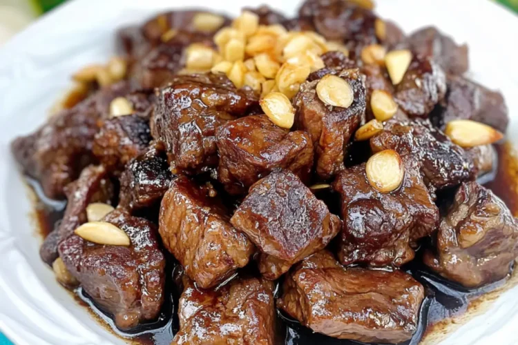 Pour in the oyster sauce and quickly toss everything together, ensuring the beef is evenly coated in the glossy sauce. Add the crispy fried garlic back to the pan for an extra garlicky kick. Turn off the heat and let the dish rest for a minute, allowing the flavors to meld before transferring it to a serving dish.