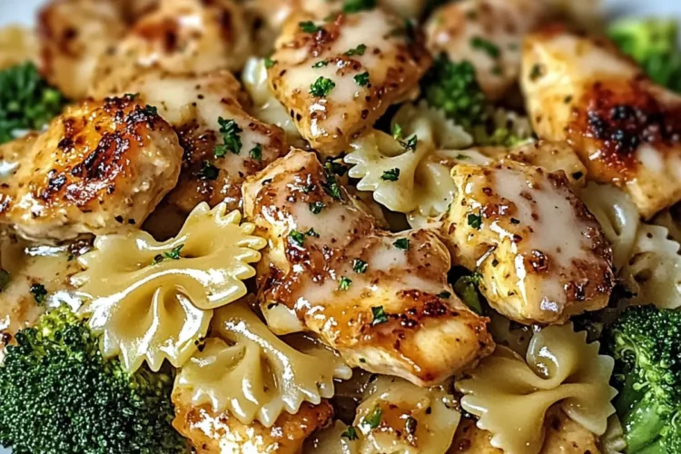 Bring a large pot of salted water to a rapid boil over high heat. Add bowtie pasta and cook according to package instructions until al dente, usually about 8–10 minutes. In the last 3 minutes of cooking, gently drop in the broccoli florets. Once cooked, reserve about ½ cup of pasta water, then drain the pasta and broccoli together, letting them rest while you prepare the chicken.
