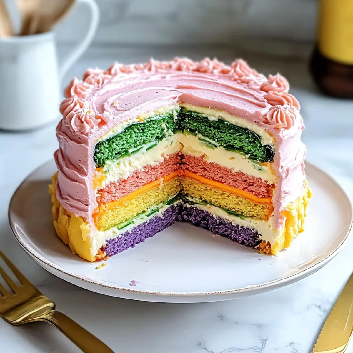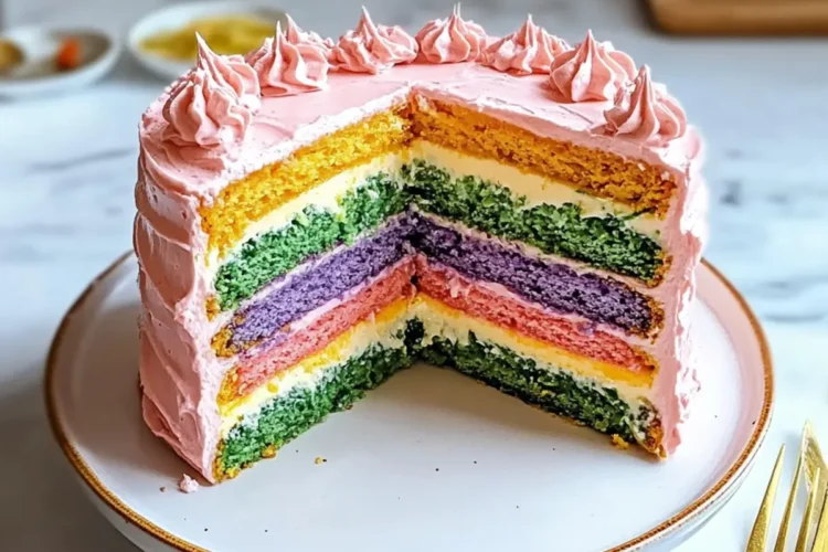 Vibrant Colors: This Colorful Rainbow Veggie Cake showcases stunning layers that’ll brighten any table, making it a visual delight for your guests.