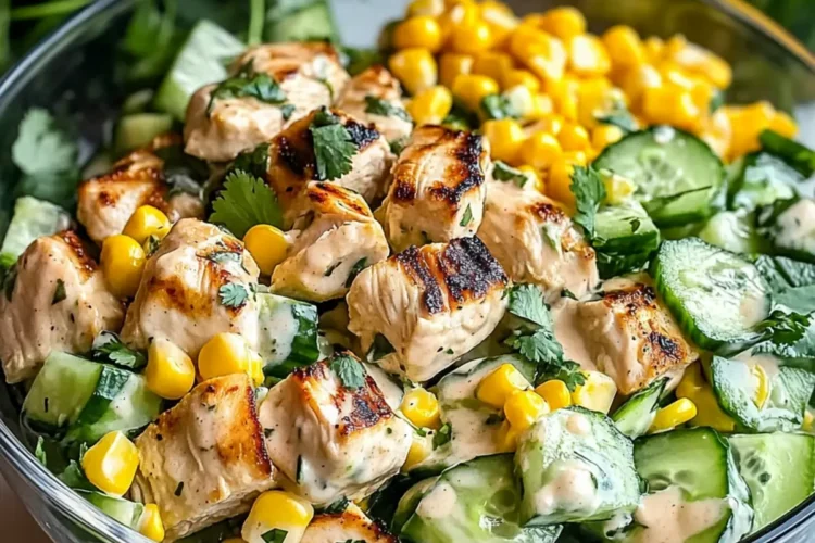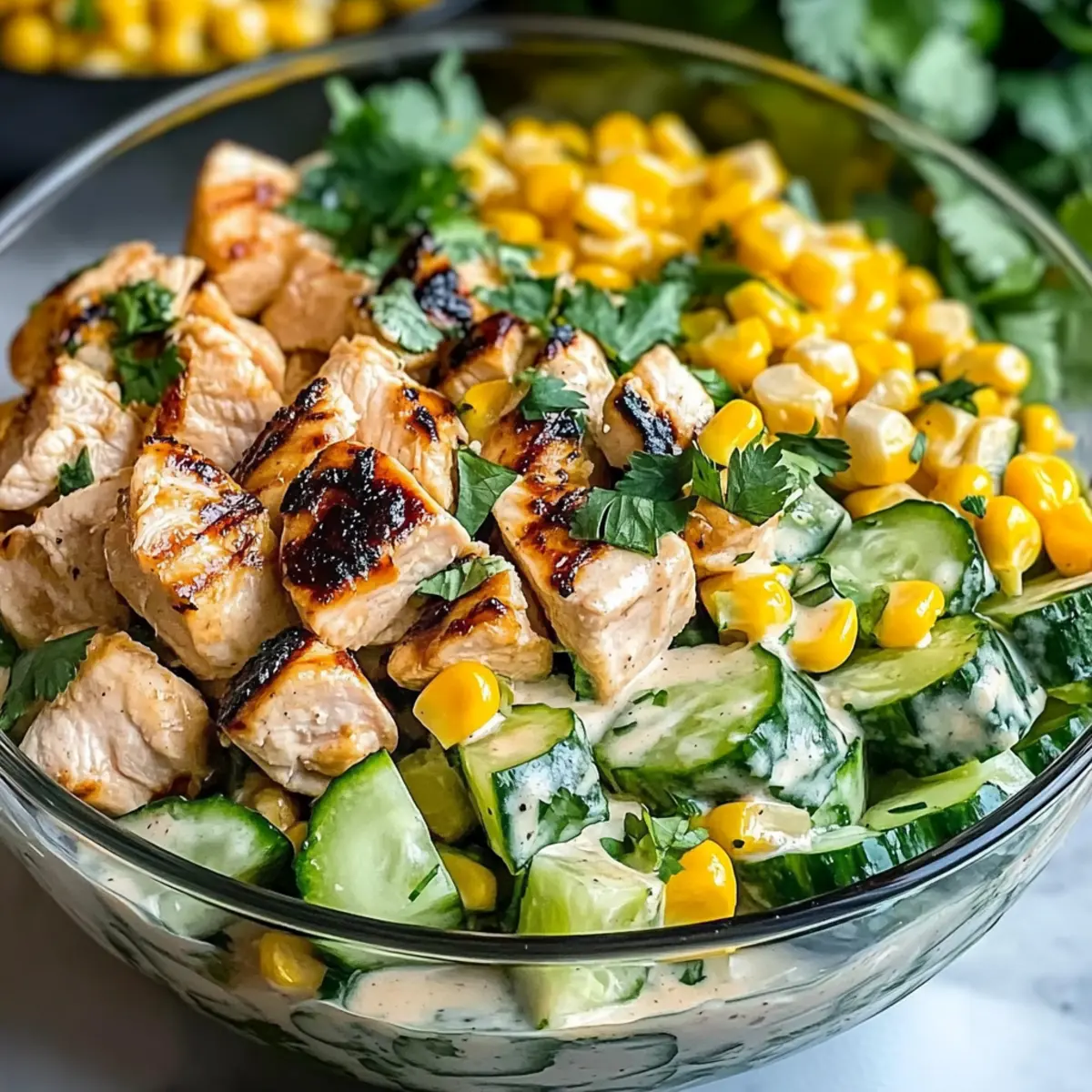 Experience the delightful fusion of grilled chicken, crunchy cucumbers, and sweet corn in this Creamy Cucumber Chicken Salad.