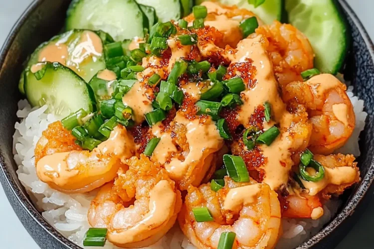 Once everything is ready, toss the fried shrimp in the cooled Bang Bang sauce, ensuring each piece is well-coated. Serve the shrimp over a generous scoop of rice and arrange the diced cucumbers, shredded carrots, and sliced green onions artfully on top. For an extra touch, garnish with cilantro, lime wedges, and toasted sesame seeds, elevating your bowl with fresh flavors.