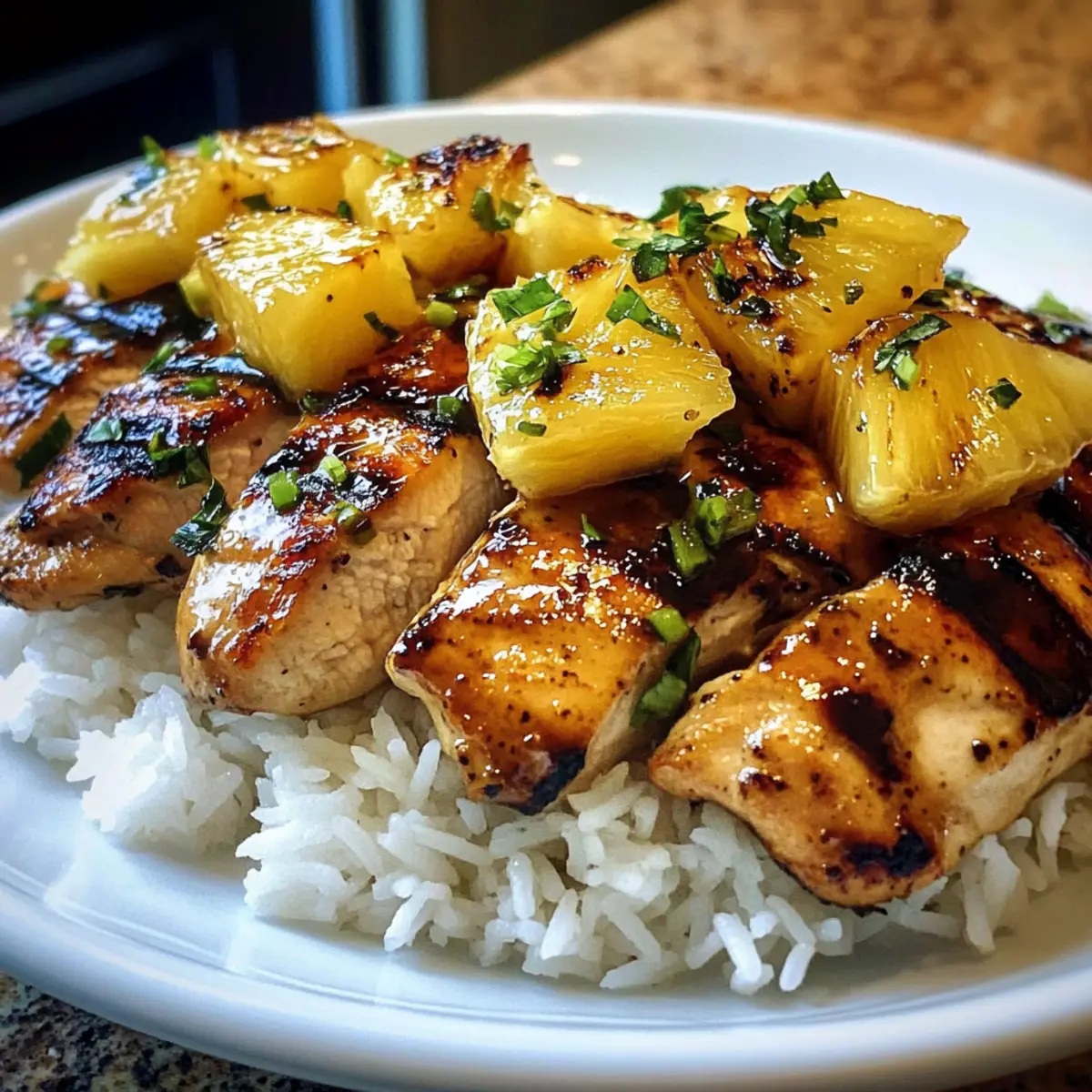 - Serve by scooping cooked rice onto plates and topping with grilled chicken and pineapple chunks.