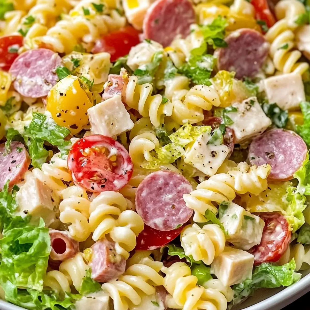 Absolutely! I recommend using short pasta like penne or rotini for this salad. They hold the dressing and mix in well with the meats and veggies. Ensure you cook it to al dente; overcooked pasta can lead to a mushy salad.