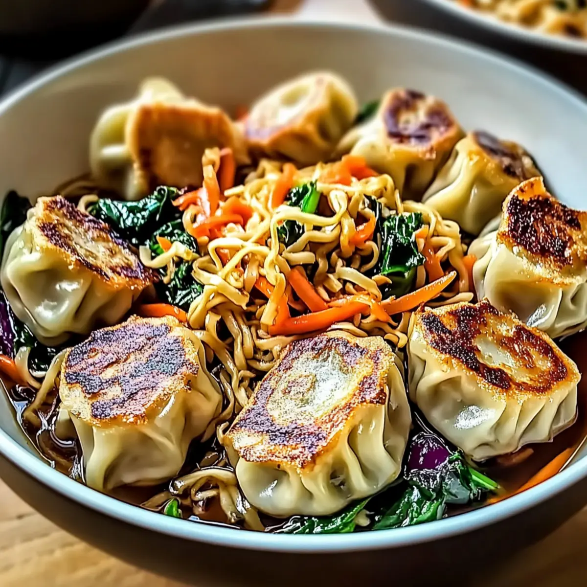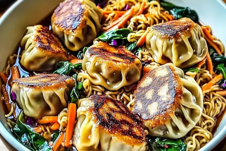 Carefully place the crispy potstickers back into the skillet, gently folding them with the noodles and vegetables. Heat everything over medium-low for an additional 1–2 minutes just to warm through, making sure not to break the potstickers as you combine them with the noodle bowls.