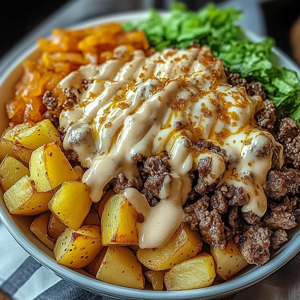 5. Assemble bowls by layering crispy potatoes, smashed beef, caramelized onions, and shredded cheese. Drizzle with sauce and add optional toppings like pickles and lettuce.