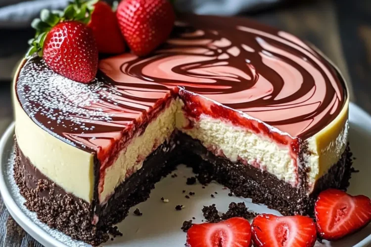 This Strawberry Swirl Cheesecake combines rich chocolate and vibrant strawberries for a delightful dessert experience.