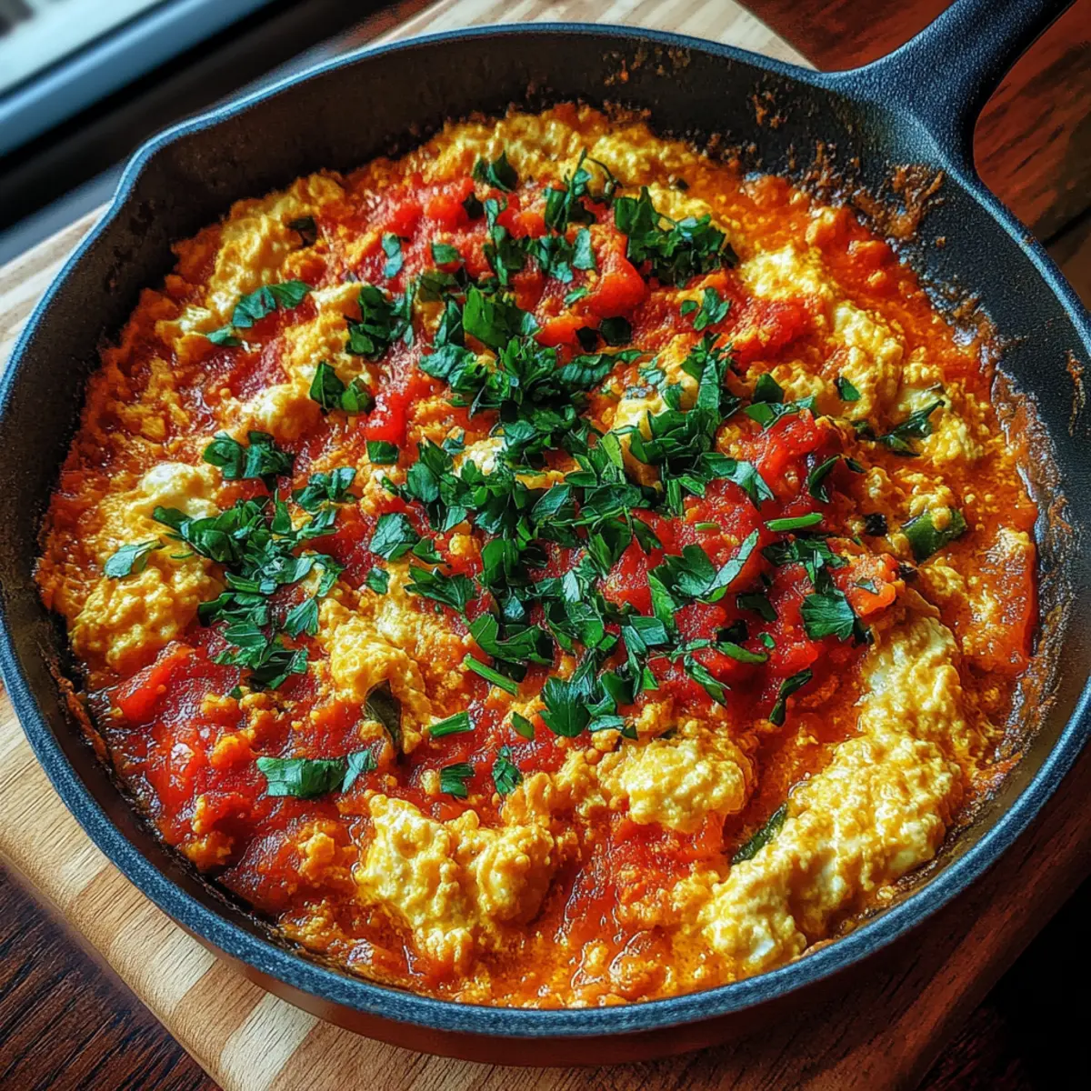 Once the eggs are just cooked through and still glistening, remove the skillet from the heat. Serve your Turkish Scrambled Eggs and Tomatoes directly from the skillet, paired with crusty bread for dipping. This dish is best enjoyed hot, allowing the vibrant flavors and creamy texture to shine in each comforting bite.